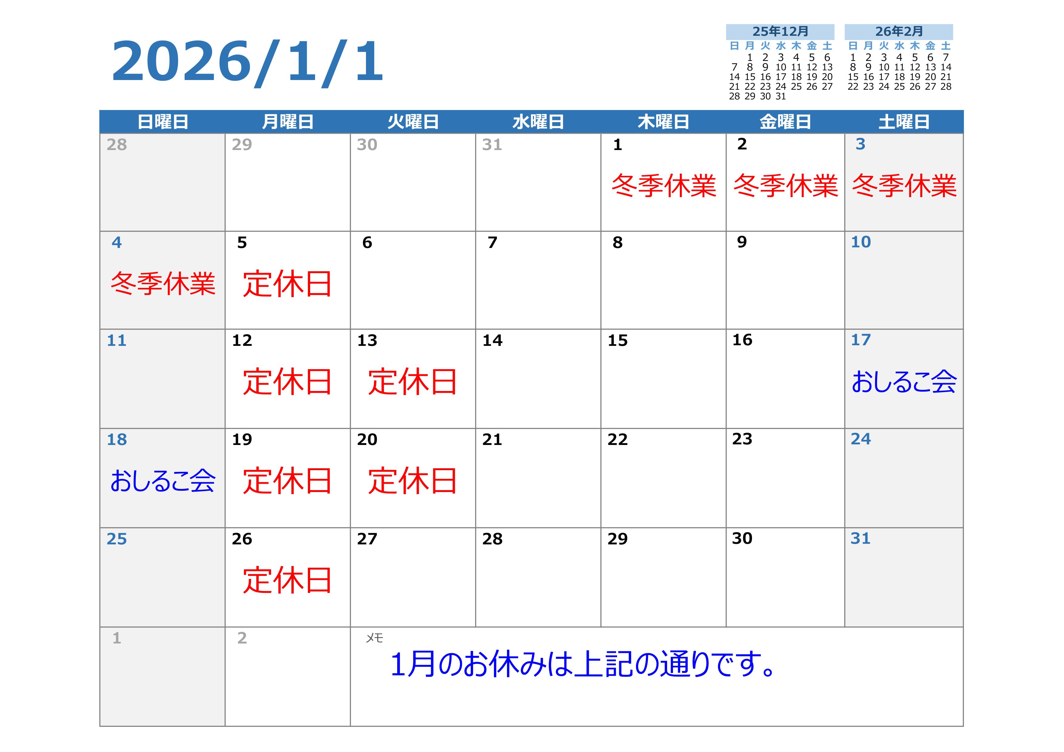 1月のお休みのお知らせ