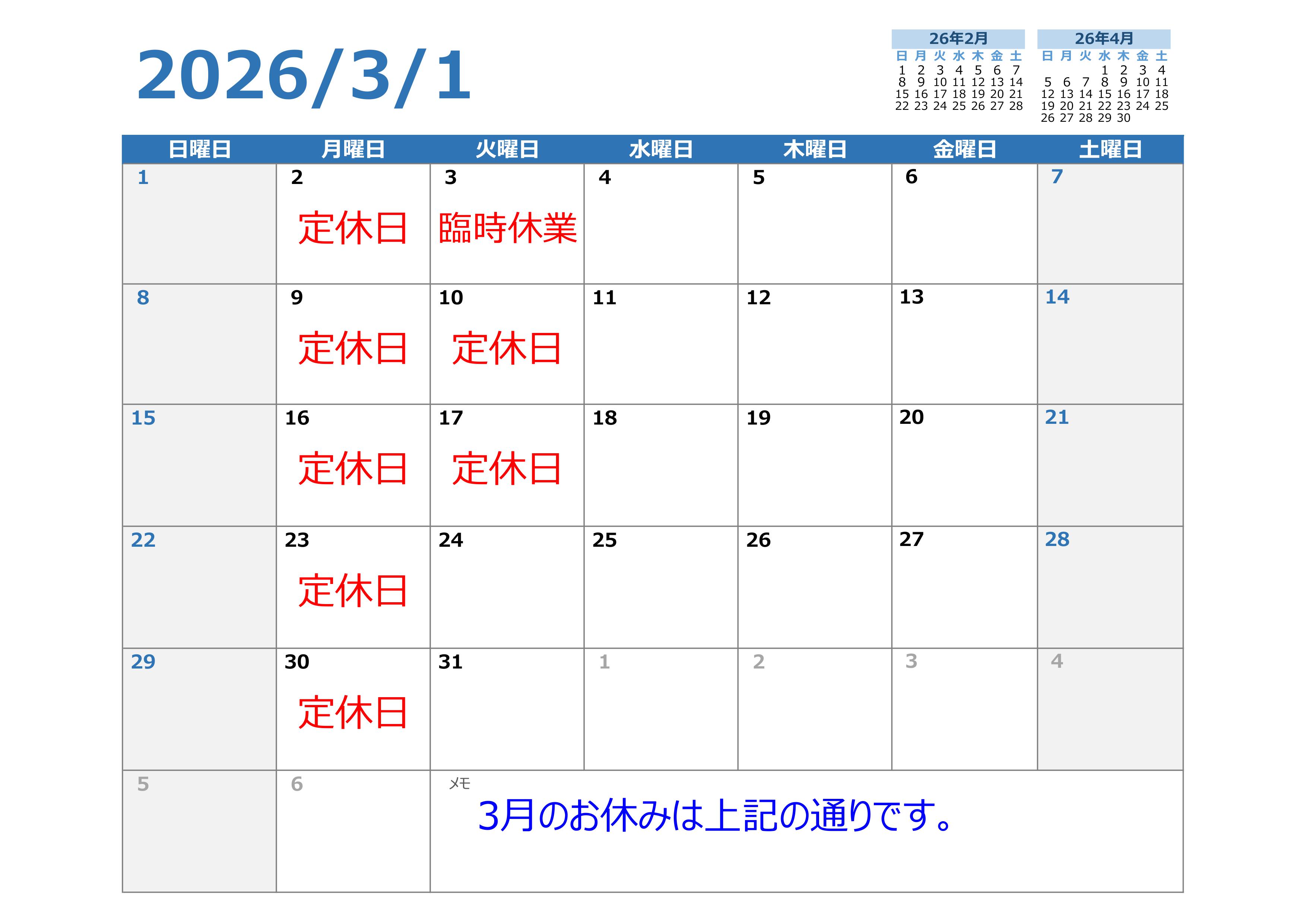 3月のお休みのお知らせ